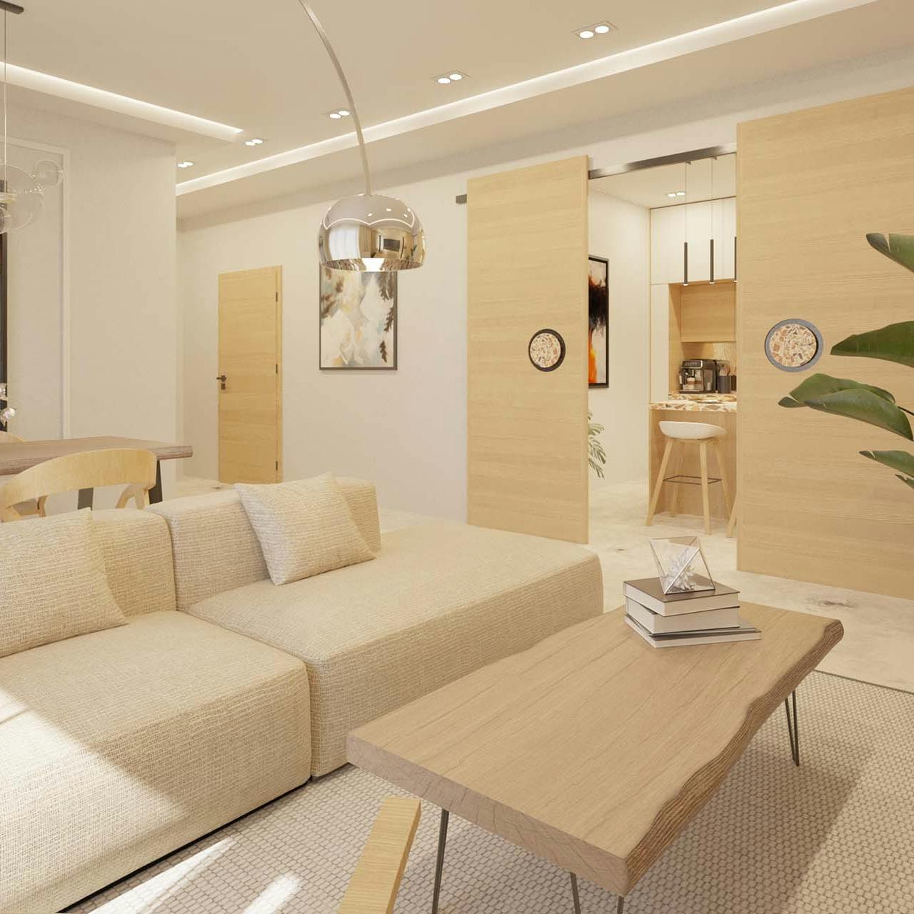 Vous aimez les intérieurs simples où règne le confort, mais vous ne pouvez pas imaginer un samedi soir sans votre émission Netflix préférée ? Aucun problème. Les doubles portes coulissantes dans le salon seront idéales pour cacher la TV et créer un espace clos pour un home cinéma tout en conservant toutes les fonctionnalités de la TV. Quoi qu'il en soit, voyez par vous-même.