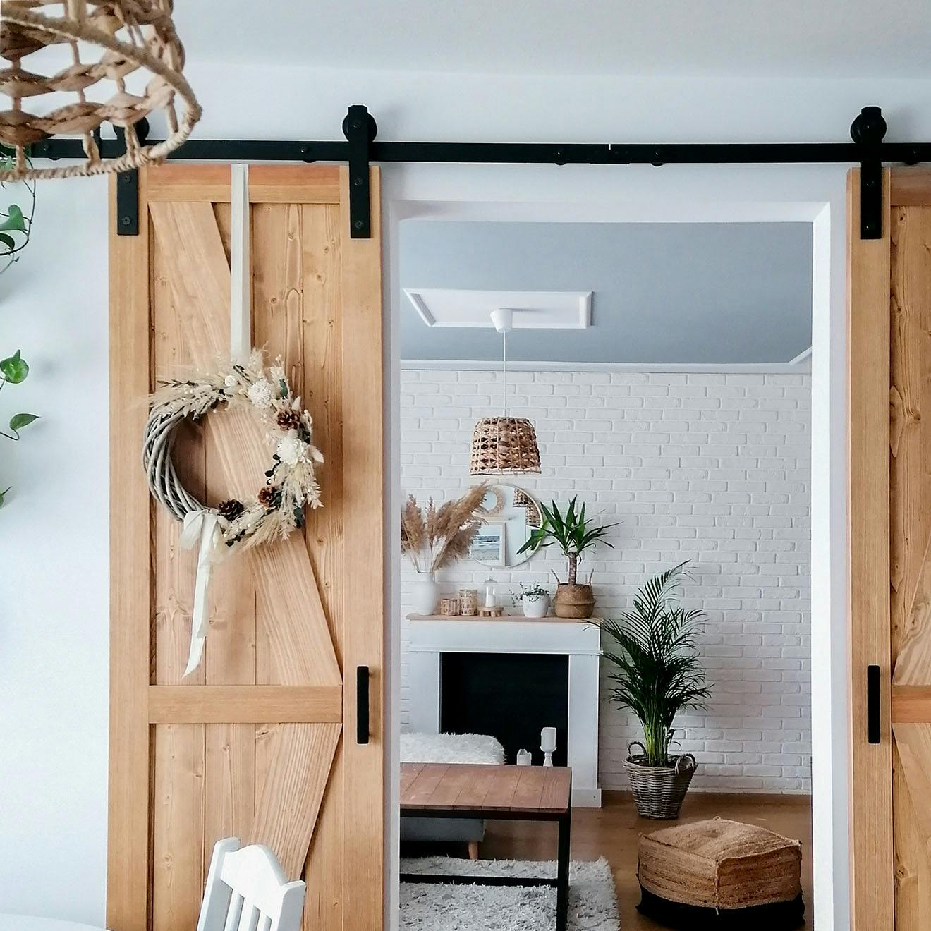 Et ce n'est pas la seule proposition pour ce type d'intérieur. Voir les arrangements ci-dessous, dans lesquels règne une combinaison d'accessoires naturels et de portes coulissantes industrielles dans un style loft. Regardez comment le cadre en acier noir s'harmonise à merveille avec la couronne généreuse et large. Légèreté et élégance se conjuguent ici avec la nature, constituant une sorte de lien avec les autres décorations.