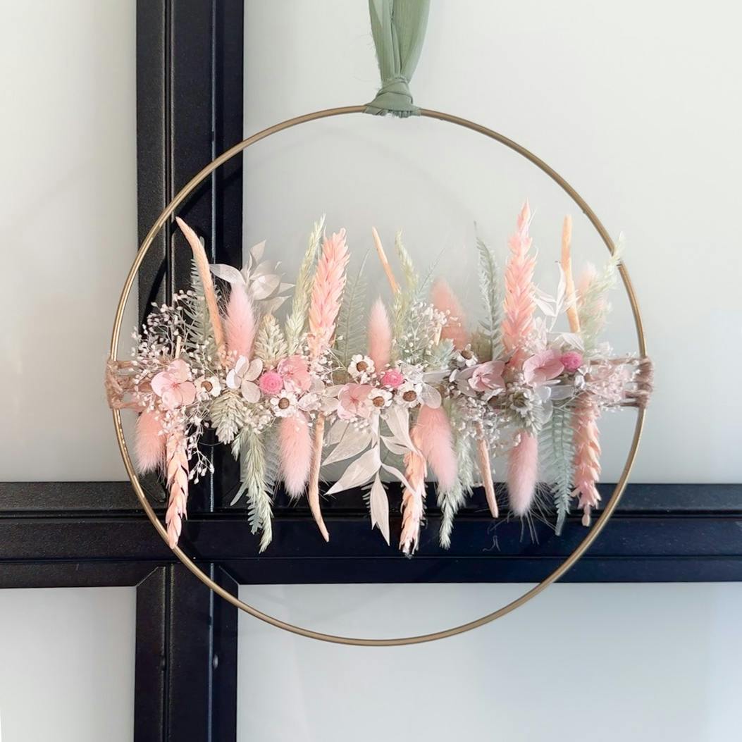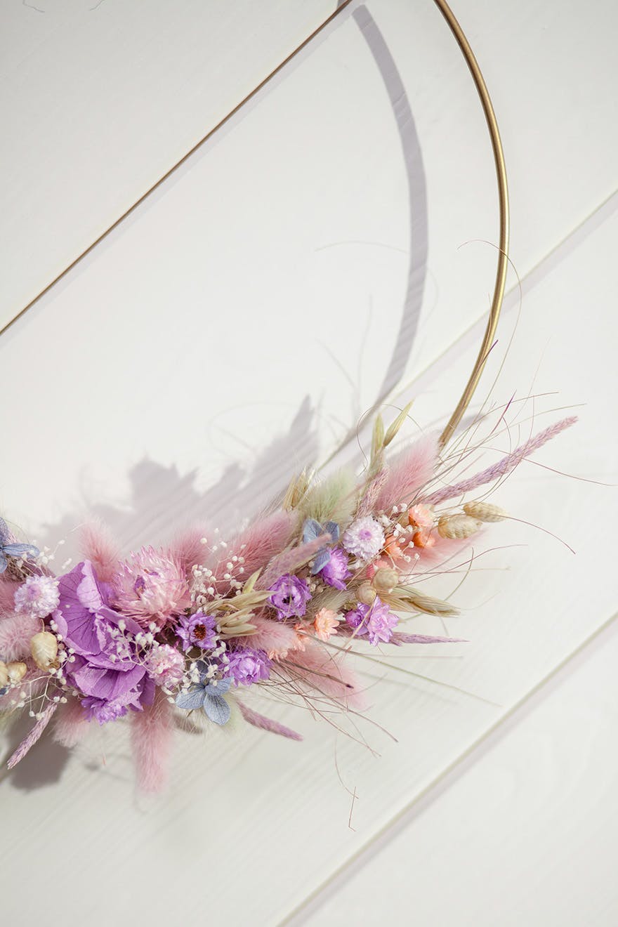 Peut-être quelque chose de plus délicat ? Enfin, nous avons pour vous une composition magiquement lavande, simple, mais belle et saturée. Il s'agit d'une couronne de porte unique tressée sur un fin cerceau en métal. Il ravira les amateurs de solutions élégantes et minimalistes. Les cerceaux pleins et les cerceaux partiellement tressés seront une idée fantastique pour les intérieurs simples. Ils leur ajouteront une pincée de glamour, et grâce au fait qu'ils sont plus petits, ils n'attireront pas autant l'attention. Graminées, céréales, gypsophile, verge d'or et autres fleurs séchées ont été utilisées pour créer la couronne de porte.
