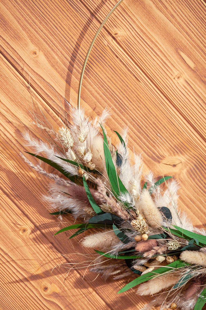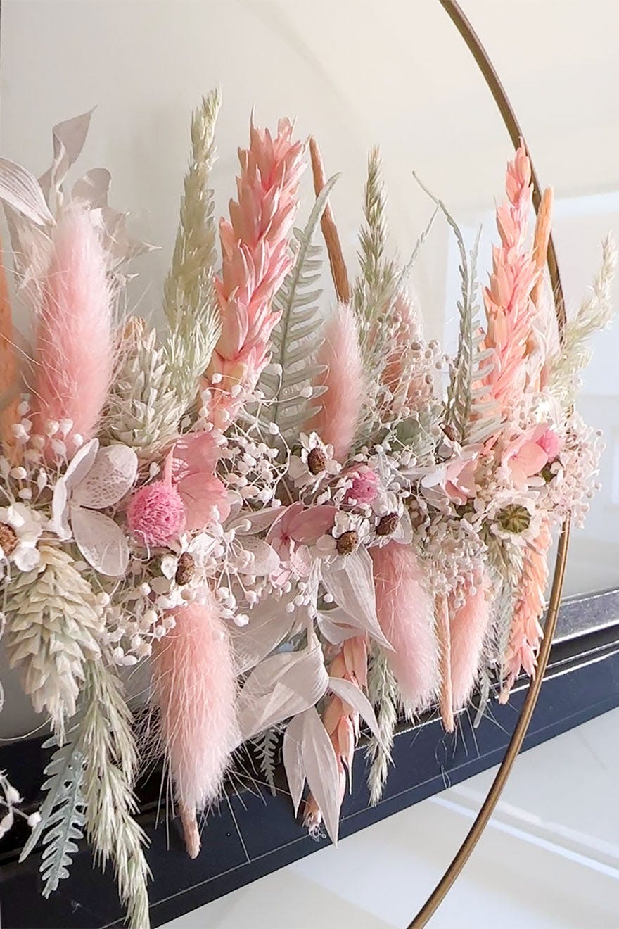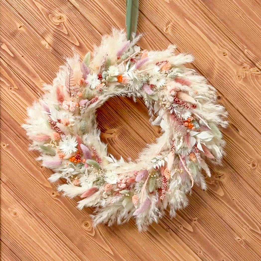 La grande couronne plaira à tous les amateurs de style bohème et d'intérieurs chaleureux, cosy et colorés. Pampas, graminées ornementales, lagurus, alpiste et petites fleurs créent une composition magique pleine de charme, et le cerceau de paille ajoute un caractère rustique. Ce type de couronnes sera parfait pour les intérieurs de style champêtre, en particulier les fermes modernes, ainsi que ceux inspirés d'éléments bohèmes ou ethno.